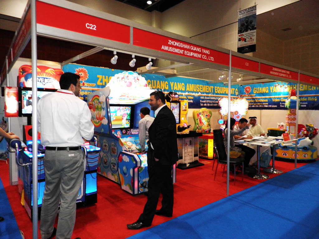 2012年4月17日至4月19日,光陽游樂設(shè)備有限公司攜新款機臺:歡樂投球,真人拳擊王,扳手腕,大錘手等精品機臺亮相于2012杜拜國際游戲展。 在為期三天的展會中,我司的機臺吸引了不少的參觀者,得到了不少買家的好評!同時我們向我們的外國朋友承諾將一如既往的做好我們的工作,給廣大客戶最好的回報!在此感謝各方朋友對我們工作的支持和厚愛!