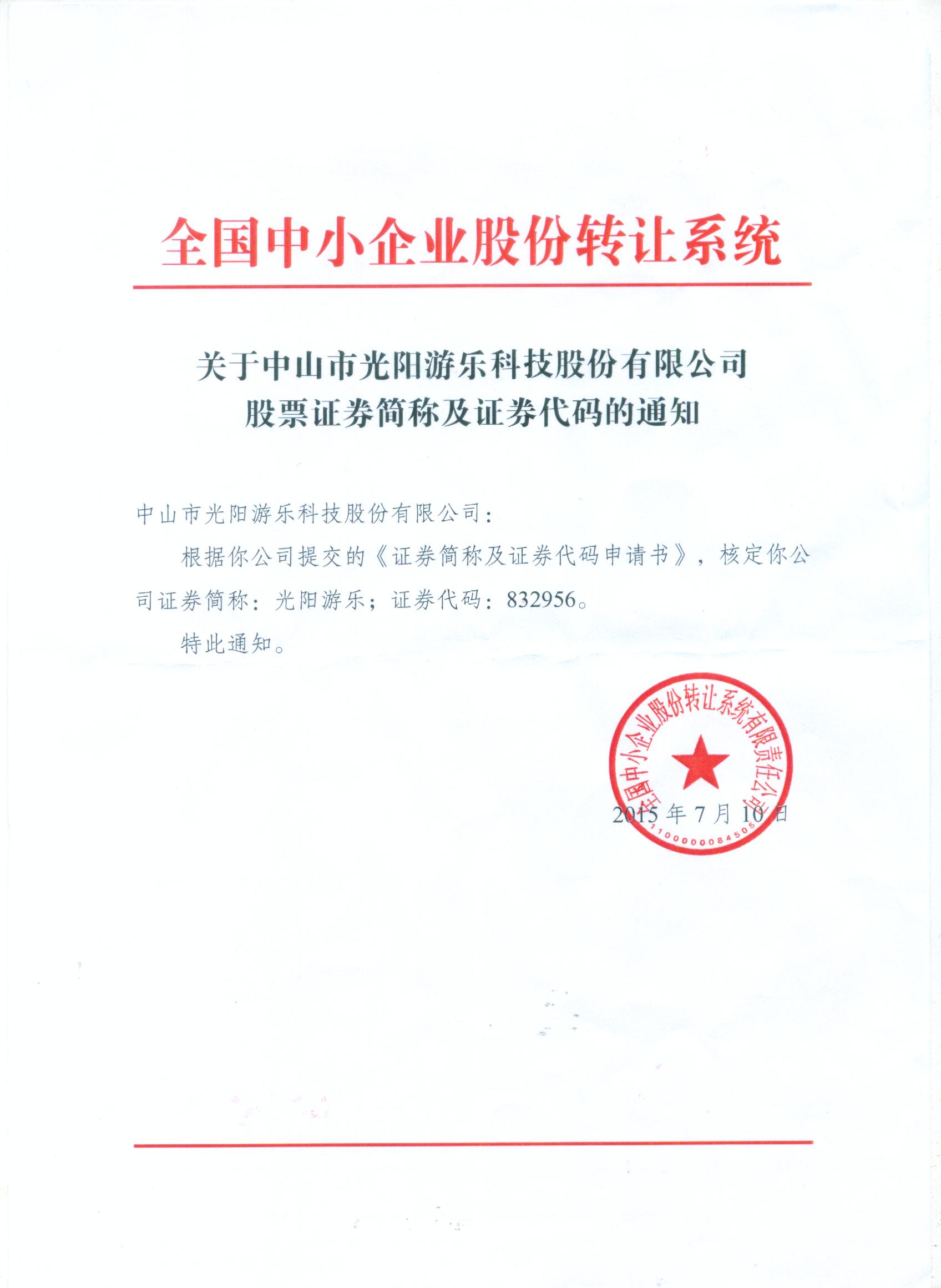 梅花香自苦寒來!火熱的七月,勤奮耕耘的光陽人迎來激動人心的時刻,中山市光陽游樂科技股份有限公司“新三板”掛牌上市成功獲批!光陽人共同見證了這一重要的歷史時刻。我司驕傲的成為游樂行業(yè)第一家上市企業(yè),業(yè)界第一股!光陽游樂開啟了企業(yè)打造品牌效應(yīng),創(chuàng)新發(fā)展邁上了新的征程,對于推動游樂行業(yè)發(fā)展、激發(fā)創(chuàng)新活力將具有意義深遠(yuǎn)。