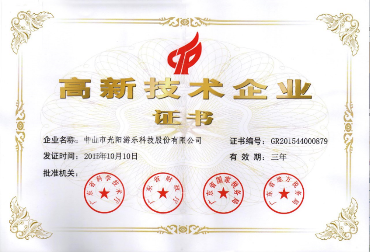 2015年中山市光陽游樂科技股份有限公司被國家認(rèn)定為高新技術(shù)企業(yè),并獲得高新技術(shù)企業(yè)培育入庫單位。獲得國家級高新技術(shù)企業(yè)稱號是光陽游樂公司技術(shù)水平和產(chǎn)品技術(shù)含量取得進(jìn)步的一個(gè)里程碑。2016年國家正式向我司頒發(fā)了高新企業(yè)證書!